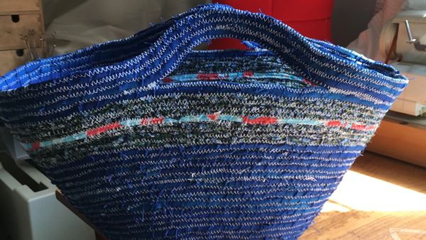 Large shopping basket made from baling twine wrapped in blue cotton curtaining SOLD