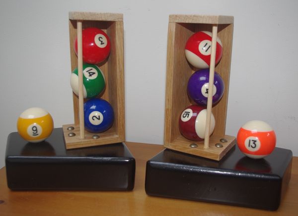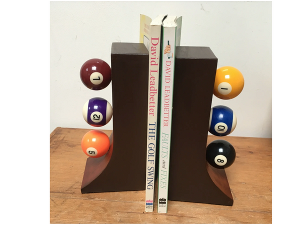 Bookends from reclaimed sofa feet and old pool balls. SOLD
