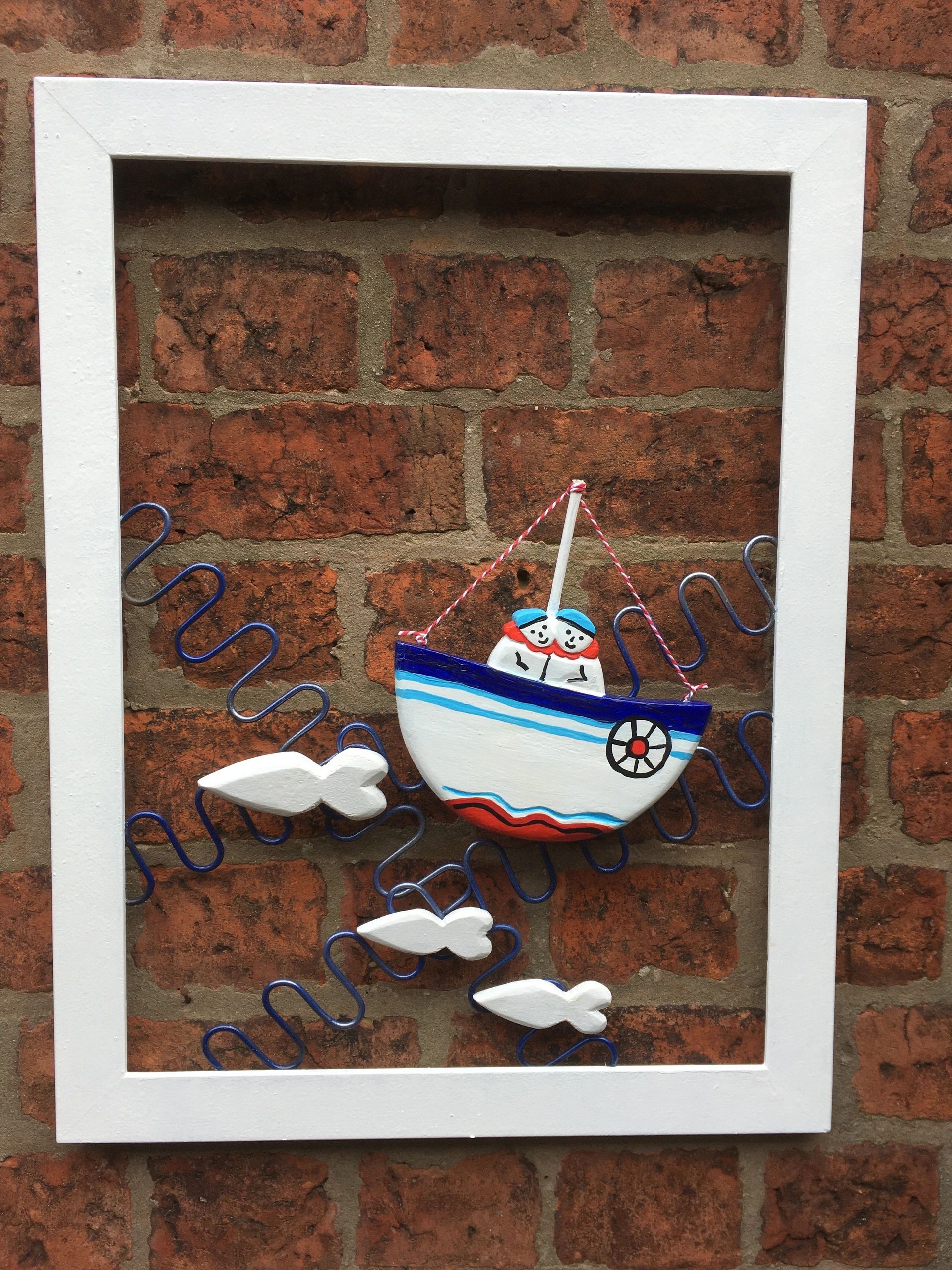 Wooden painted boat with wood fishes fixed onto salvaged chair springs, mounted in white wooden reclaimed frame.