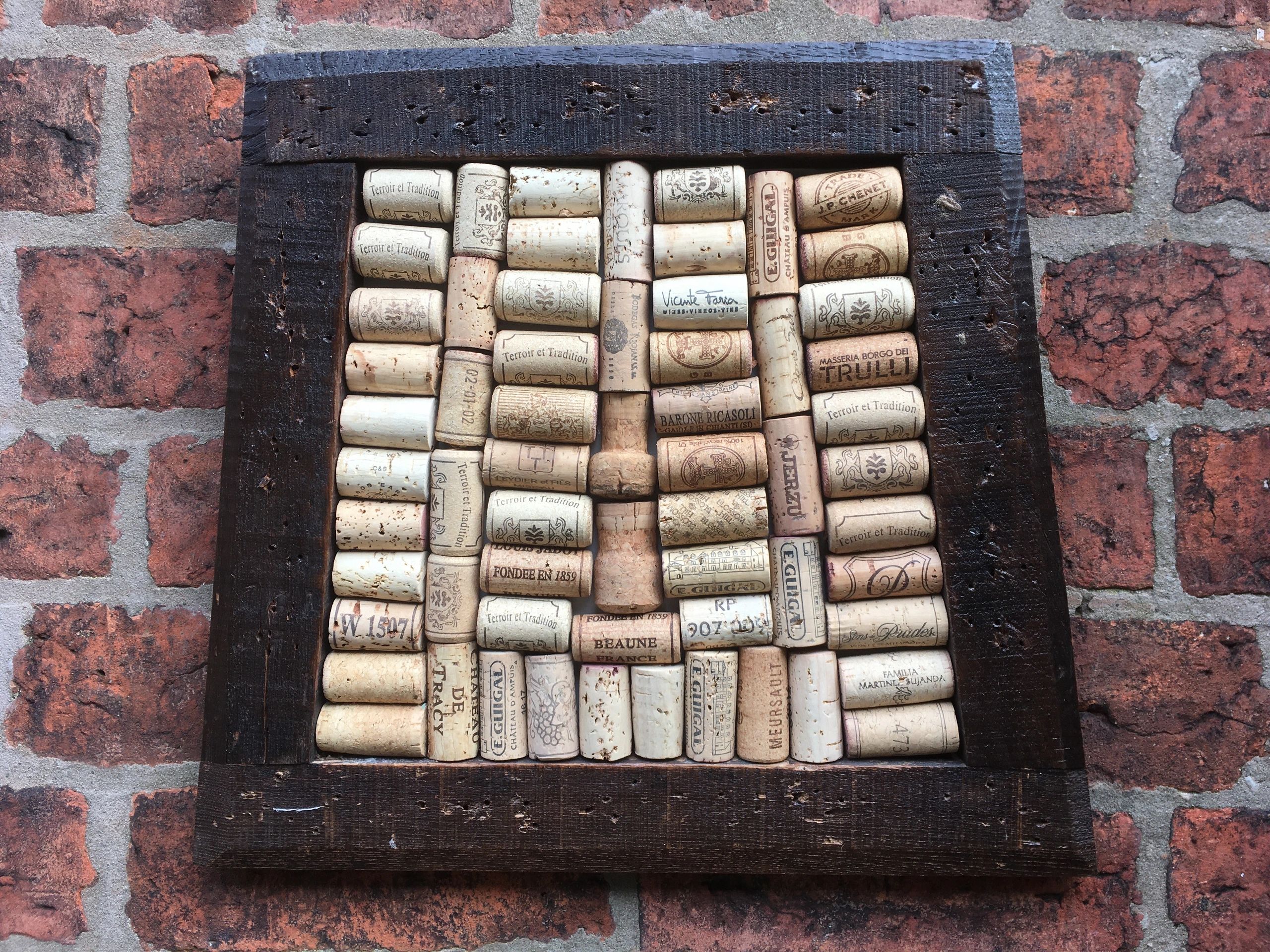 Used wine corks fixed into wooden chair seat base. Holes from upholstery tacks left for character.