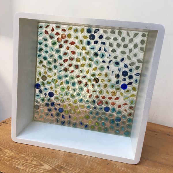 Salvage box frame filled with resin embedded glass marbles SOLD