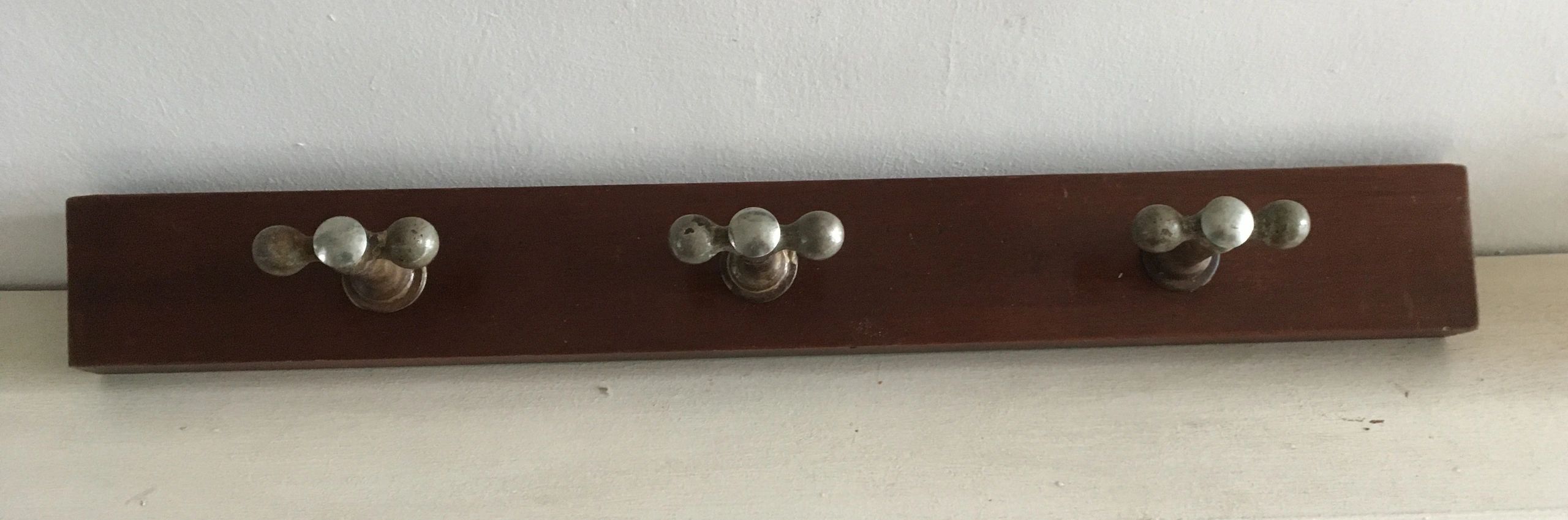 Wall mounted coat hanger, vintage brass gas taps mouted on reclaimed mahogany wooden base.