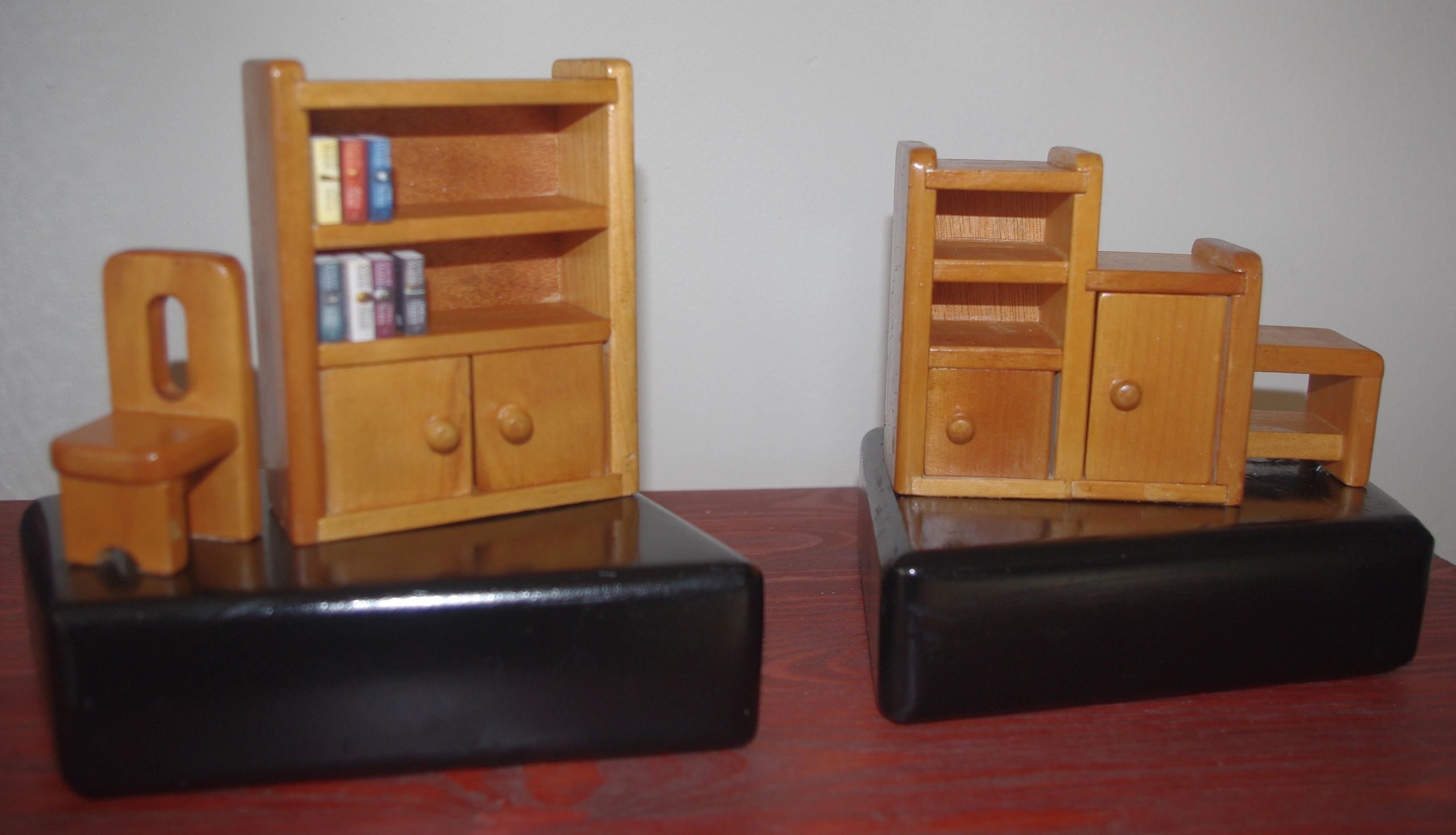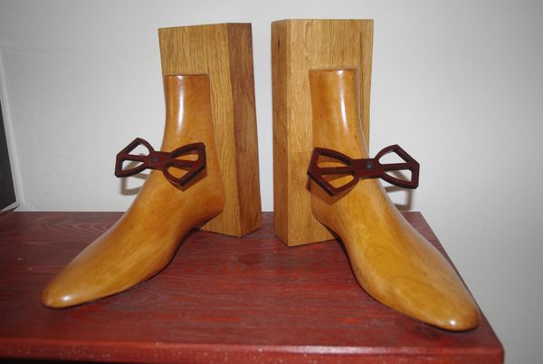 Bookends using beech shoe shaper with wooden bows mounted on oak ends SOLD