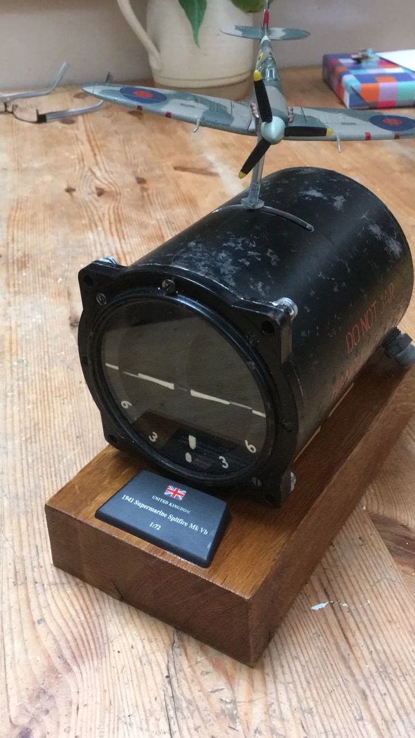 Model Spitfire mounted on 1947 artificial horizon aircraft instrument SOLD