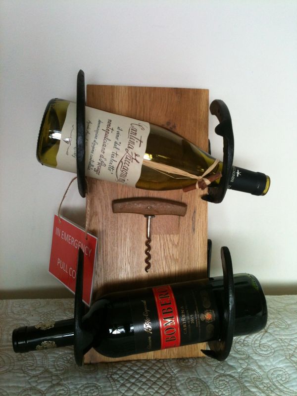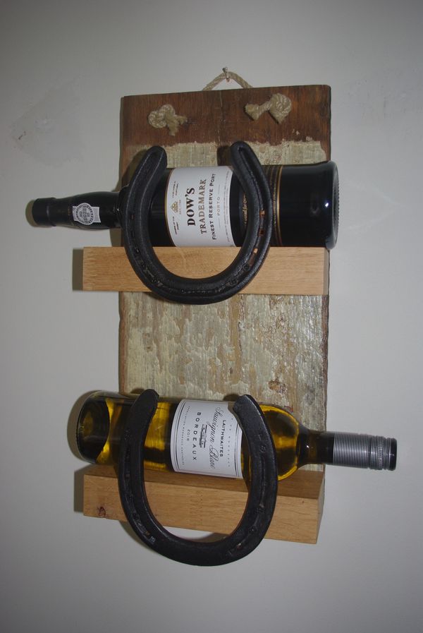 Wine rack -wall mounted on oak plus cork screw and black painted horse shoes
