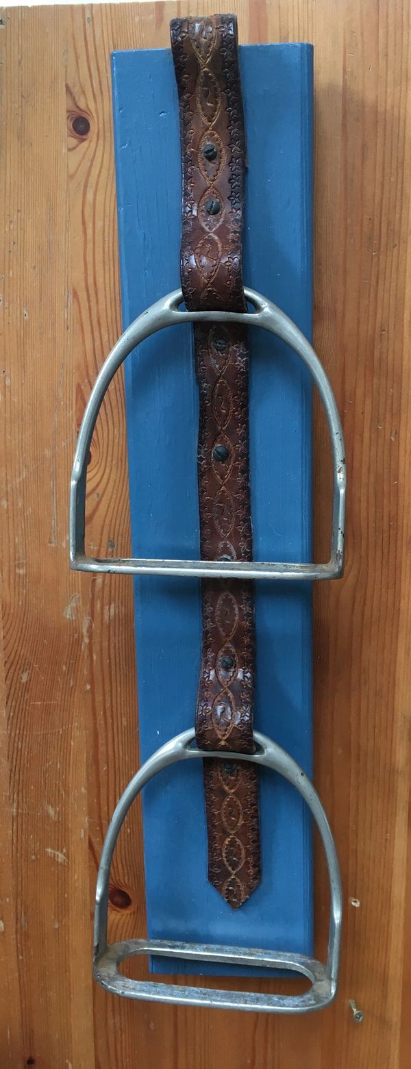Useful and decorative items made from old riding stirrups, mounted on salvage wood, often using old tack leather.
