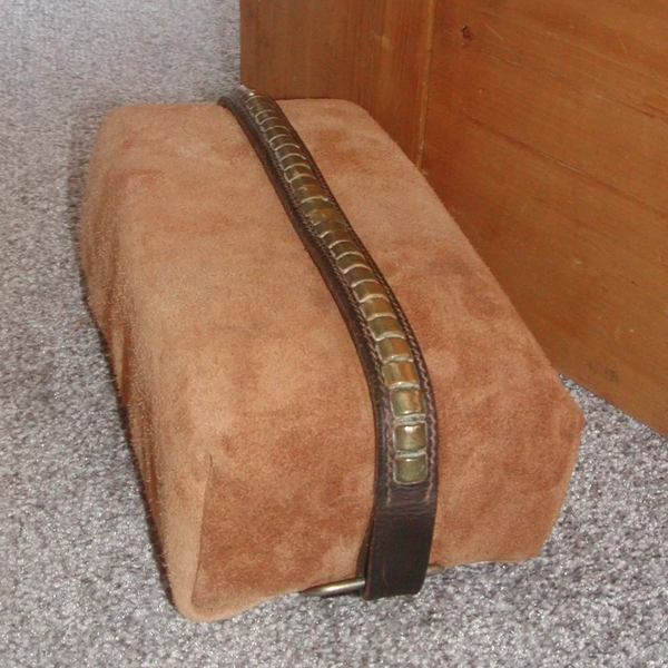 Door stop , brick covered in reclaimed leather with horse leather brow band SOLD